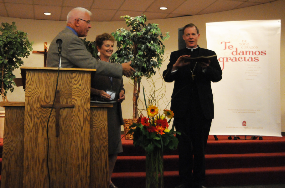 SALT LAKE CITY — Durante los últimos nueve años, un pequeño grupo de Católicos han ofrecido un apoyo que ha sido vital para el Diocesan Development Drive (DDD). Los miembros de este grupo el cual es conocido como Bishop’s Leadership Society, contribuyen con por lo menos 1000 dólares cada uno al DDD. Este año los miembros del grupo hicieron un compromiso de 605,472 dólares ó el 32 por ciento de la suma total comprometida en la Diócesis. De manera significativa, Bishop’s Leadership Society forman sólo el 5 por ciento de las personas que contribuyen al Diocesan Development Drive: Este año de los cerca de 7,700 donadores en la diócesis, 371 eran miembros de esta sociedad. "Uno se puede dar cuenta de como cada uno de nosotros forma una papel muy importante para el éxito de la recaudación de este año", dijo Michael Stransky quien junto con su esposa Carolyn, ha sido parte de esta sociedad desde antes que esta fuera fundada hace nueve años. "Desde el 2004 los miembros de la sociedad… han aportado mas de 5 millones de dólares a la Diócesis a través del DDD - una cantidad muy significativa para un número tan pequeño de personas". De Stranskys fueron los maestros de ceremonias durante la cena de apreciación 2012 de Bishop’s Leadership Society la cual tuvo lugar el 5 d septiembre en la parroquia de Saint Thomas More. Este año 45 nuevos miembros se unieron al grupo y 32 fueron reconocidos pro haber cumplido 5 años de formar parte de este. "El próximo año celebraremos nuestro décimo aniversario y anticipamos que 127 de nuestros miembros serán reconocidos por sus 10 años de ser miembros", dijo Michael Stransky. La cena comenzó con una Liturgia de las Horas, presidida por el Reverendísimo John C. Wester, Obispo de Salt Lake City. "Que gran alegría es para mí el poder orar junto a ustedes esta noche", dijo el Obispo Wetser. "Esto significa mucho para mí, el hecho de poder reunirnos como el Pueblo de Dios y celebrar una tarde de oración juntos. Este es un regalo maravilloso". El Obispo Wester dijo que la tarde fue más que una tarde de donaciones. "De lo que se trata esta noche es de la Iglesia. Mientras que es cierto que en nuestra sociedad y en nuestro mundo necesitamos del dinero para que las cosas funcionen, eso no es de lo que nosotros estamos hechos. La Corresponsabilidad es acerca de la gratitud y de la apreciación de nuestros regalos. Es acerca de lo que hacemos con nuestros regalos para demostrar nuestro aprecio". El Obispo Wester nombró varios programas que el DDD apoya, incluyendo la formación continua de sacerdotes, las escuelas católicas y las oficinas administrativas de la Diócesis. Están sucediendo muchas cosas y estoy ante ustedes, las personas que han hecho posible que esto suceda en nuestra Diócesis. Sin ustedes esto no sería posible", dijo el Obispo.