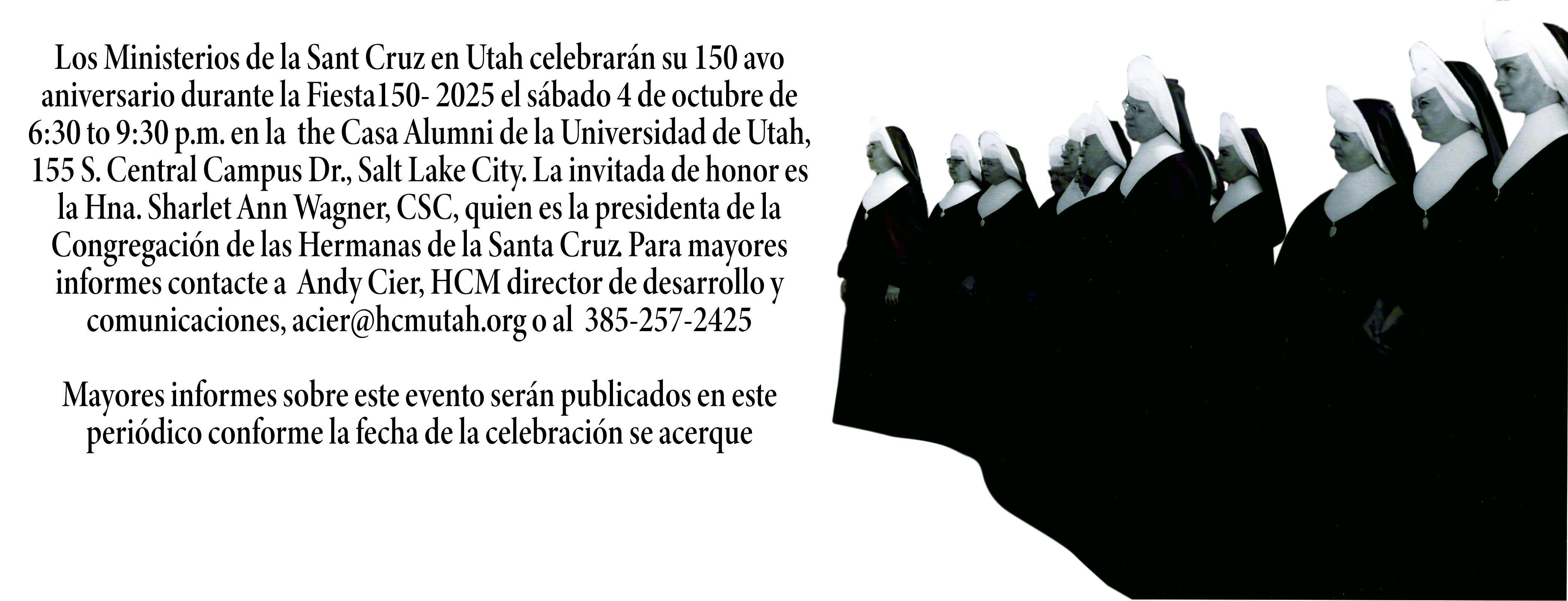 SALT LAKE CITY — El 5 de junio de 1875, las dos primeras Hermanas de la congregación de la Sant Cuz llegaron para realizar ministerio en Utah, asentándose en Salt Lake City, por la invitación del entonces Padre Lawrence Scanlan (Obispo en 1891), quien supervisó la Iglesia en Utah; la madre Mother Mary Augusta y la Hna. Raymond llegaron de St. Mary’s en Indiana. El periódico Salt Lake Herald anuncio la llegada de las Hermanas al territorio de Utah declarando que “es su intención establecerse en Salt Lake City y establecer una escuela abierta para todos, esperan contar con la buena voluntad y cooperación del público.”