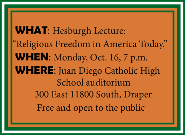 The Hesburgh Lecture is named for a former university president, the late Fr. Theodore Hesburgh, CSC. In addition to sponsoring the lecture, each year club members participate in six to 10 activities, including service projects, worship and socials. While many Notre Dame alumni are members, the Utah club is open to anyone interested in the mission and goals of the university, Dimpel said. Club members will have information available at the Oct. 16 event for those who would like to know more.