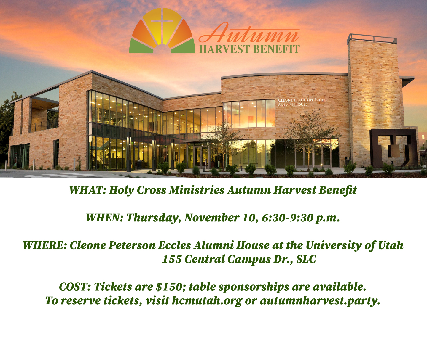 SALT LAKE CITY — Holy Cross Ministries is holding its Autumn Harvest Benefit at a new location this year. The venue for the Nov. 10 event is the Cleone Peterson Eccles Alumni House at the University of Utah; in the past it was held in Summit County.