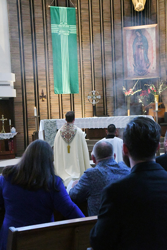 On June 29, the day before Bishop Oscar A. Solis ordained two men as priests and one man as a transitional deacon for the Diocese of Salt Lake City, a Holy Hour for vocations was held at Saint Ann Catholic Church in Salt Lake City. Shown is Father Joseph Delka, the diocesan vocations director. IC photo/Marie Mischel