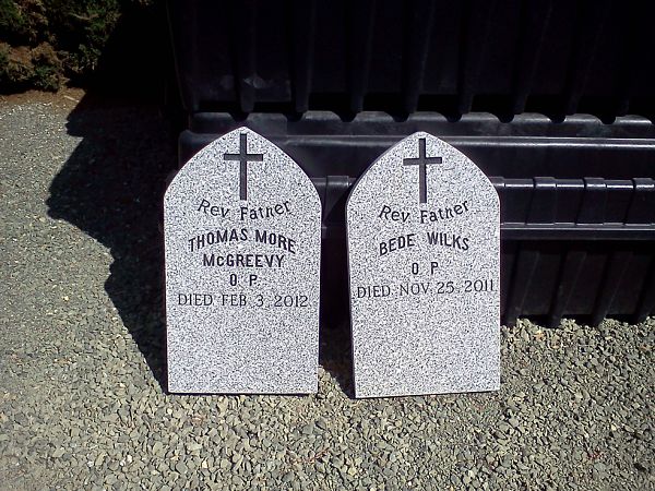 The tombstones for Dominican Father Bede Wilks and Dominican Father Thomas More (James) McGreevy, were delivered to the Western Dominican Province cemetery in Benicia, Calif. on the same day, March 10. They will be installed when weather permits. Fathers Wilks and McGreevy were the first co-pastors of the Diocese of Salt Lake City’s Saint Catherine of Siena/Newman Center, across the street from the University of Utah. The center was founded in 1981. Fr. Wilks died Nov. 25, 2011; Fr. McGreevy on Feb. 3, 2012. The homily for Fr. Wilks ended with some words that Dominican Father Leo Thomas preached at Fr. Wilks’ first Mass: "The priest comes facing his ministry with a history. He looks back on this history wondering what God has in mind. He does not know, he will not know, not clearly; it is a mystery; but he knows this: that if Christ’s work is to be done it will be done by the influence of this man who has his own history… This history has made him what he is. Christ chose him, Christ will use this… Christ has chosen him out to do some work that no one else could do. This will go on. It will go on until the appointed time, until all has been accomplished; until the will of the Father in heaven has been fulfilled this will go on, until all is summed up in Christ, until all are at one, each with another, and all with God."