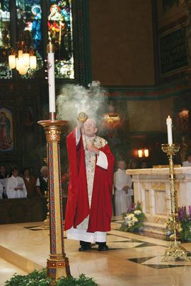 The descent of the Holy Spirit on Mary and the Disciples after the Resurrection is celebrated on the Feast of Pentecost. At the Vigil of Pentecost June 3, in the Cathedral of the Madeleine, Diocesan Administrator Msgr. J. Terrence Fitzgerald censes the paschal candle at the beginning of Mass. At right, Msgr. Fitzgerald confers the Sacrament of Confirmation, a gift of the Holy Spirit, upon Maria Concepción Briseño of Sacred Heart Parish. Her sponsor, Dolores Gutierrez, stands behind her. The Feast of Pentecost is rich with symbols of the Holy Spirit – the dove seen by Saint John the Baptist after he baptized Jesus in the River Jordan; the wind heard in the closed upper room as the Holy Spirit descended upon the disciples; and tongues of fire seen to descend on the disciples’ heads, after which the disciples were heard ‘speaking in tongues,’ and being well understood by all who heard them. The homily for the Vigil of Pentecost is found on page 13.