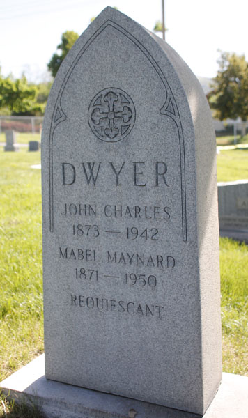 Another site of interest at Mt. Calvary is the grave of John and Mabel Dwyer, which rests under a tree near the far eastern border of the cemetery. They were the parents of Robert J. Dwyer, the first native Utahn ordained to the priesthood. He later became Bishop of Reno and Archbishop of Portland, Oregon. In addition to being an accomplished historian, Bishop Dwyer was an architectural expert. The grave marker, which he designed himself, is a beautifully proportioned Gothic arch upon which are inscribed his parents’ names and the simple epitaph "Requiescant" (They Are Resting).