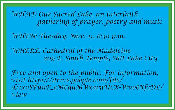 SALT LAKE CITY — An interfaith gathering of prayer, poetry and music focused on the Great Salt Lake will be presented at the Cathedral of the Madeleine on Nov. 11.