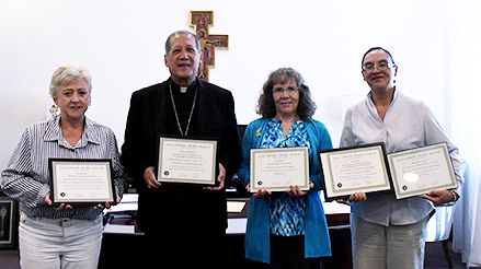 The Intermountain Catholic earned five awards at this year’s Catholic Media Association awards banquet. Shown from left are Linda Petersen, staff writer; Bishop Oscar A. Solis, publisher; Marie Mischel, editor; and Laura Vallejo, staff writer.