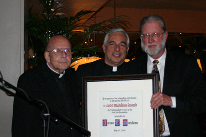 SALT LAKE CITY — James T. Svendsen was presented with the Madeleine Award for Distinguished Service to the Arts and Humanities at the 2009 Madeleine Award Dinner at the New Yorker May 10. "People of excellence have far excelled in our ability to recognize excellence and prominence in this community, so it is again a pleasure to welcome you here on behalf of the Cathedral of the Madeleine," said Msgr. Joseph M. Mayo, rector of the Cathedral of the Madeleine. "One hundred years ago the Cathedral of the Madeleine was just being finished as a building," said Msgr. Mayo. "One hundred years ago Zions Park was named a national park by President Franklin D. Roosevelt. One hundred years ago, the Salt Lake City Police force received their first motor bikes. I went to the city’s luncheon this week, and it was fun to learn of these events that happened in 1909. One hundred years is really quite an accomplishment. "We are highlighting these events at the Cathedral of the Madeleine in very unique and beautiful ways with performances and speakers, and the events that will take place during the course of this year," said Msgr. Mayo. "I am sure Bishop (Lawrence) Scanlan (1891-1915) would be very proud to see everyone here tonight and to see the music program and the events that are a reality of his church. So as he lies in a restful slumber at the opening of the altar, we continue to do the work that he began." "Dr. Svendsen, you are certainly an icon of all that our faith tradition stands for in terms of art, music, and architecture. You epitomize, and in fact dramatize those values in this community so very well," said Vicar General Msgr. J. Terrence Fitzgerald. "Your commitment to the Greek theater and spreading the good news about the arts and who we are, where we came from, and the rich roots and classical tradition, help humanize this community and beyond. "So on behalf of the Most Rev. John. C. Wester, Bishop of the Diocese of Salt Lake City, the Cathedral of the Madeleine, and the Diocese of Salt Lake City, I present you with this award." "I am honored and deeply moved to receive the Madeleine Award for Distinguished Service to the Arts and Humanities," said Svendsen, the 2009 recipient. "I have been fortunate to find my niche here in Utah and have the opportunity to teach Greek and Latin language, literature and culture, and to share the world of ancient Greece with a wide array of audiences in Utah communities." "First and foremost, I would like to thank the Madeleine Council for their generous award for the Distinguished Service to the Arts and Humanities and the Classical Greek Theatre Festival of Utah," said Svendsen. "I would also like to thank my wife Stephanie, my sons Paul and Alex, for their loyalty, patience, and support for all those days I was gone writing grants and drafting budgets, and all those weekends spent either at the Greek play or away on tour. "I would also like to thank the Departments Literature and Theater for supporting the opportunity for me to develop a special niche in the humanities and the fine arts," said Svendsen. "My thanks to the Utah Humanities Council, the Utah Arts Council, the Salt Lake City Arts Council, and to Arts and Parks for their continued financial and moral support. "I am also grateful for the opportunity to create and foster The Classical Greek Theatre Festival of Utah," said Svendsen. "It is indeed rare for a professor to contribute intensely to two different departments in two different colleges, but the University of Utah and the state of Utah are rare landscapes where anything is possible. "Theater is such a collaborative art, and I would be remiss if I did not thank the dozens of directors and designers and the hundreds of actors, many just beginning their acting careers, for contributing their imagination, talent, and effort in making the Classical Greek Theatre of Utah a success and a tradition in the cultural landscape of Utah and the West. It is rare for one to be rewarded for following one’s bliss, as Joseph Campbell phrases it, for pursuing one’s passion." Svendsen is an associate professor of Classics and Theatre at the University of Utah. He received his Ph.D, in Classics from the University of Minnesota, where he specialized in Greek and Roman theatre and was actively involved in several stage, film, and radio productions. His favorite stage roles as an actor have been Talthybius in "Trojan Women," Enobarbus in Shakespeare’s "Antony and Cleopatra" and Pozzo in "Waiting for Godot." Svendsen has received several University of Utah awards for teaching and a national award for Teaching Excellence in Classics from the American Philological Association. He is the author of several articles on Greek drama and the ancient novel and has lectured widely on those topics throughout the United States and abroad. His current research project is a book on letter device in the history of the theatre, a project that combines his interests in literature and theater production. From 1971-1997, Svendsen, was an instructor and field director for the Aegean Institute, a summer institute in Greece, where he enjoyed Greek food, music and culture under the therapeutic Greek sun. He is the founding father and currently artistic director and executive producer of the Classical Greek Theater Festival of Utah, the annual production and tour of an ancient Greek tragedy with a broad outreach program to colleges and schools.