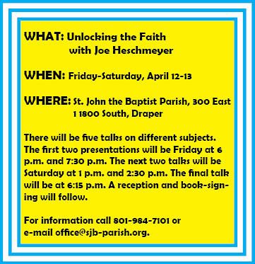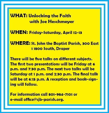 DRAPER — St. John the Baptist Parish will present “Unlocking the Faith with Joe Heschmeyer,” a free event for anyone who wants to learn more about the Catholic faith.