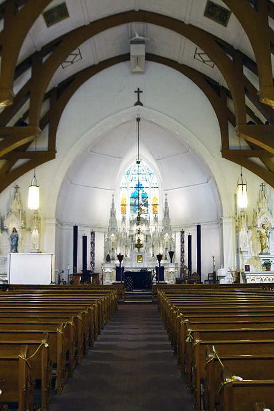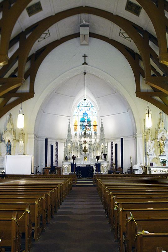 The church itself is a massive sandstone building set on the top of a hill. The interior is spacious, with a gleaming white altarpiece adorned with spires and backed by a blue stained glass window. Other stained glass windows are installed all along the east and west walls, as well as above the choir loft in the back of the church. The Eternal Light is suspended from a gold chandelier above the altar. It’s such a beautiful church that it sometimes is called the Cathedral of the North.