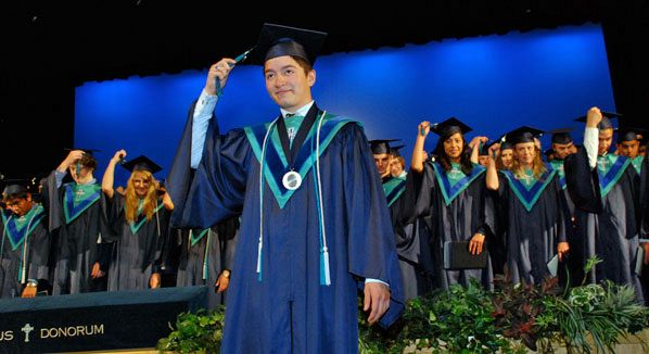 Note: coverage of the St. Joseph Catholic High School and Judge Memorial Catholic High School graduations appeared in the May 30 issue of the Intermountain Catholic. DRAPER — From the first fresh rose laid at the base of the statue of Saint Juan Diego May 24 in the rose garden in the high school’s plaza, to the last 2008 graduate who left the auditorium after the commencement exercises, the school’s theme: Spiritus Donorum (the Spirit of Giving) and the theme of the 2008 class, Unity, permeated the ceremonies. The class of 2008, after they attended the diocesan Chrism Mass and saw the following scripture passage, adopted it as their own: "Behold how good and pleasant it is when friends live together in unity." (Ps. 133) Words that encouraged the class to form closer personal relationships. Ninety-seven percent of the 2008 graduate have been accepted at major colleges and universities, and the graduates, as a group, earned $6.4 million. Sixty-three percent of the graduates are already taking college level courses. As the school’s principal Dr. Gabriel (Galey) Colosimo read the many honors this class already had earned, the students grinned and smiled at each other, obviously proud of each others’ accomplishments. Their emphasis on unity also assisted the class in breaking down barriers and emphasized the fact that the students were guided through the year by the Holy Spirit. Valedictorian TheresaXuan Pham spoke of the school taking her on a personal journey – from being a work-a-holic to a young woman who had found God and who has now learned to "embrace every moment." Her experiences at Juan Diego Catholic High School moved her from an overfocused young woman of "scattered memories," to a "mature young woman of dreams." The class of 2008 had two Salutatorians, Alina Aimie Borchardt and Rebecca Mary Bradley. Borchardt spoke of being a painfully quiet young woman who learned from her teachers that "greatness comes from the ability to share of yourself." She learned she could make the biggest impression on others by her deeds and by becoming a positive influence on others. "This sense of unity and truth will open a multitude of doors for us," Borchardt said. Bradley shared a story about one day on which everything went wrong, and the school helped her through projects, quizzes, arguments with classmates, and spilled lunch. "Everyone has a story of mistakes and failures," she said. "They make you stronger, and they help you face every moment with your best foot forward. Awards significant to the school were given to outstanding students and teachers: Elliott Schatten was given the St. Thomas Aquinas Award; Meredith Fall earned the St. Teresa of Avila Award; Stephanie Bertumen earned the St. Cecilia Award; Devin Kallas was given the Saint Sebastian Award, Teacher Sherry Evans was given the Saint Michael the Archangel Award, and Father John Norman was given the Spiritus Donorum Award. Later, Dr. Galey Colosimo and John Colosimo were given the Spiritus Donorum Honor by Most Reverend John C. Wester, bishop of the Diocese of Salt Lake City. As John Colosimo, assistant principal read out each name, the graduates filed downstage to receive their diplomas from Bishop Wester. Bishop Wester spoke in gratitude of Holy Cross Sisters Catherine Kamphaus, superintendent of Catholic schools and Genevra Rolff, assistant superintendent, and of Dr. Colosimo, the faculty of Juan Diego Catholic High School, the staff, the school’s administration, its parents, and its alumni. "We are all very proud of these graduates and this school," the bishop said. He spoke of the importance of names and the significance of the students hearing their own names called out at graduation. He also spoke of the importance of protecting our names and our identities, but said, "our greater fear is that no one knows your names… We fear anonymity: not being recognized, never being affirmed and called by name." The bishop said perhaps the most important thing the graduates had learned at Juan Diego Catholic High School was who they are and their identities in relationship to others. Through campus ministry they learned to worship and pray. The school has taught them service to others in the community, how to help the needy, the poor, and strangers, and how to see God’s face in the poor and the stranger. At Juan Diego they also have made valued friendships, and learned the meaning of loyalty, commitment, and service. "You have learned that you have been called by name by God: that you have been loved into existence, and sustained in that love," Bishop Wester said. "You are called to the goal of taking that love into eternal life. "Today, you are called by name again as you receive your diplomas," he said. "Your parents called you by name at birth. The priest or deacon called you by name at your baptism, the bishop or minister of your church called you by name at Confirmation or another ceremony… You know that you are loved; you know that people cherish your name "Now, as you take this next step, do the same for others. Name injustice and fight for the truth. Name poverty and give of yourselves to enrich others. Name prejudice and welcome the stranger in our midst. Name hatred and bring love into a broken world. "What’s in a name? Everything! We cherish you as we call you by name. "Never forget ‘that at Jesus’ name every knee must bend in the heavens, on the earth, and under the earth, and every tongue proclaim to the glory of God the Father: Jesus Christ is Lord!" Top, salutatorian Alina Borchardt speaks to her classmates about their academic journey so far, and where they’ll be headed. At left, Bishop John C. Wester of the Diocese of Salt Lake City helps Meredith Fall adjust her cap and bobby pins. Below, class leader Eduardo Santana leads the 2008 Juan Diego graduates in the changing of the tassel.