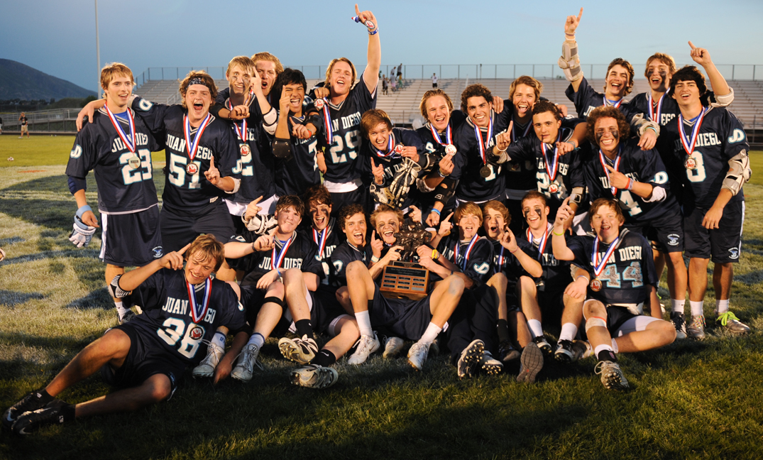 DRAPER The Juan Diego Catholic High School Soaring Eagle lacrosse team battled from behind to claim its first state championship title at Brighton High School May 19. The Soaring Eagle team was down 7-4 with just over 10 minutes left in the game when players mounted an impressive comeback to tie the score, then get that last winning goal. "With 52 seconds left in the game, freshman Matt Graney scored the winning goal to beat Alta High School 9-8," said Patrick Lambert, Juan Diego coach. "The final game was an absolute thriller and our boys just never quit. That was one of the defining factors of this team, they always knew they were a very good team and everyone trusted that the person next to him would do his job and play his position. It was a lot of fun to watch." The state championship game "was unbelievable," said Jeff Tack, Juan Diego assistant coach. "Patrick told the team, ?Respect your opponent and leave it all out on the field; you can come off the field and can honestly say you've done your best. The result is going to be the result.' When they were behind a couple of times during the season, we told them, ?You know how to throw and catch, just play.'" Juan Diego lost two games during the regular season, each by one point; one to Alta and one to Brighton High School. "Our games were thrillers all season long, and to go a whole season with our total losses totaling two points led to a great year," said Lambert, adding that they beat Brighton 6-4 in the state semi-finals. "We gave up the least amount of goals of any team this year. Our goalie, Erik Gronseth is an absolute brick wall, and our defense never let teams get comfortable. We were phenomenal offensively starting two juniors, attack players Tommy Maddox and Luke Graney, and freshman attack player Matt Graney. Teams didn't know how to defend our talented attack, and one or two of those three would have a fantastic game." In an April 17 game against Copper Hills High School, Juan Diego won 21-6. Matt Evans, Copper Hills coach, complimented Juan Diego's team in a letter, saying, "I have tremendous respect for Coach Lambert. He always puts together an extremely competitive team. Your program completely dominated my team?yet they were respectful throughout the game." Also during that game a Copper Hills' player was injured. Evans wrote that he was impressed that Curtis Buck from Juan Diego, who was involved in the play, later called to check on the player's condition. Lambert said his team captains seniors Erik Gronseth, Jeff Malone, Tyler Buck and Mitchell Rall were excellent leaders and kept everybody motivated. "They kept the team working in the off-season and would come early to practice to set up the field," said Lambert. "It's a special year when you know your captains are fully committed. Practices were fun. Games were a blast. The bus rides were great. It was just one of those seasons where I'm speeding to get to practice because I can't wait to see the boys. We also teach them life lessons and do as much training as we can to help them communicate, learn about hard work and succeed on and off the field. They are true champions and an incredibly deserving group of boys to have the season end the way it did."