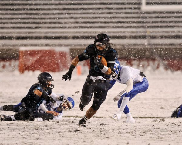 DRAPER — The Juan Diego Catholic High School football team was undefeated going into the 3A state semifinal game against Dixie High School, but lost 14-13 at Rice-Eccles Stadium under the lights on a snow-covered field Nov. 9. "We had too many penalties, turnovers, and missed assignments to win the game," said John Colosimo, Juan Diego head coach. "That’s the nature of playing games. I think it was an upset; on a dry field it might have been a different outcome, but both teams had to play on it and they managed it better than we did." In the quarter finals, the Soaring Eagle team shut out defending 3A state champion Hurricane High School 38-0. Juan Diego won Region X for the 10th straight year and has won the state championship in 2002, 2004, 2008, 2009 and 2010. "We have a good program and we are very proud of our kids," said Chris Long, Juan Diego athletic director. "Coach John Colosimo has built the program into one of the premier programs with the best winning percentage in the state of Utah. His record is 117-28 since the school opened in 1999." During the season, the Soaring Eagle team paid tribute to teammate Adam Colosimo by wearing his number 2 on their jerseys and helmets; Adam Colosimo died July 10 after an accident. "He was always on our minds and in our memories, but football was a great healing tool for us and allowed us to come together and keep Adam close to our hearts," said Coach Colosimo, Adam Colosimo’s uncle. Colosimo explained the work ethic and dedication was the true testament of honoring Adam Colosimo. "We had a remarkable year," he continued. "I told the kids there are about 110 teams that play high school football in the state of Utah and about 100 of them would trade their season for ours. We won 12 games in a row and made it to the state semifinals, we haven’t lost a region game since 2005; we beat 5A Granger, 4A Skyline, Springville and Salem Hills, and we beat the 2A champs Manti, giving them their only loss. We averaged about 40 points a game in region and only gave up approximately six points in region. The kids were disappointed they didn’t get to the finals, but there are a lot of good things our team accomplished." This senior class has won four region titles, have a 47-5 record, won two state titles as freshmen and sophomores, and went to the state quarter final and semifinals as juniors and seniors, respectively, said Colosimo. "Our senior class was outstanding and our junior class was very supportive," he added. "The senior captains, Nick Markosian and Dakota Cox, did a great job in the leadership role. Markosian was the quarterback and over two years he won 17 games and lost two, which is quite remarkable. Cox was a three-year starter and played linebacker and tight end; he is going to play football at the University of Cincinnati." Numerous other seniors and juniors have contributed to the success of this year, he said. "Kahea Chang, a senior wide receiver, defensive back and a leader by example, was an inspiration to a lot of the kids," said Colosimo. "Zach Schekel, also a senior, was a three-year starter at center and was the linchpin of our offensive line and was the kind of kid that would play with a lot of heart and determination and we’re very happy that he might have a chance to play some college ball as well."