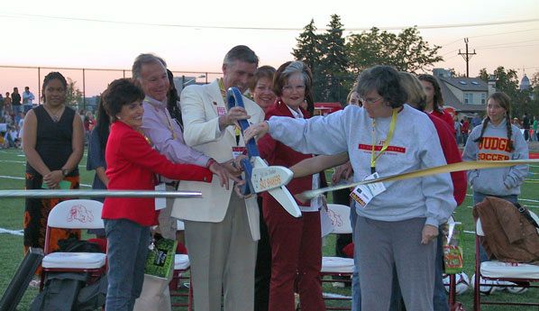 SALT LAKE CITY — "This Field of Dreams, is an extension of the dream my father, Emmet Quinn and six of his friends had back in the late 1970s," said Dan Quinn, class of 1992 and Judge Memorial Catholic High School dean of students. "They were a group of Judge parents and alumni, who put their hearts and souls into building the first Judge football field." Judge Memorial team members, staff, administration, alumni, and fans celebrated with great joy the dedication of the new McCarthey Stadium and later their 24-7 Homecoming victory over Union High School Sept. 29. Their Homecoming theme was "Field of Dreams." "This facility is the result of our community pulling together toward a common vision," said Quinn. "We honor those who have made Judge’s field sports programs into what they are today." The field was named McCarthey Stadium because the Jane McCarthey Foundation donated $2.5 million to Judge Memorial. Msgr. J. Terrence Fitzgerald, diocesan administrator, a Judge graduate and former principal, blessed the new stadium by dedicating it to the glory of God. "We give thanks for the impact this field has had on thousands of graduates and for the significant contributions they have made throughout the world," said Msgr. Fitzgerald. Judge Memorial Principal James Hamburge thanked Clara Brennan and Mike and Kris Kladis, who led the Legacy Campaign, and helped make the stadium a reality. "This Field of Dreams is truly a miracle," said Hamburge. "It is an architectural master piece. Most of all it is a lasting tribute of the generosity and determination of the Judge community. When the stadium is complete it will have a press box, bleachers for 1,600, and permanent lights and sound. But we wanted our seniors to have a once-in-a-lifetime opportunity to play their homecoming game on this new surface and their home field." Hamburge gave special recognition to Msgr. James Kenny, who served as principal of Judge, was a bus driver, coach, teacher, maintenance man, cut the grass on the field, and served as the school chaplain. Judge Memorial Athletic Director Dan Del Porto said the new field is the single greatest impact on the students of any investment they could have made. One of the goals of Judge is to educate the whole student. Athletics plays an important role in teaching life’s lessons, which are team work, discipline, citizenship, and the value of hard work. The new field will provide more opportunities for training, conditioning, and skill development. Del Porto thanked Hamburge for his part in making the new field a reality. Salt Lake County Mayor Peter Corroon said the field is a wonderful example of what can happen when students, families, teachers, and members of the community believe in something and come together to work on a common goal. Mary Schubach McCarthey said her father, Dick Schubach, and her father-in-law, Kearns McCarthey, would be very proud today. They loved Judge football, and were always on the sidelines working the chain no matter the weather. "The McCarthey family is proud to be standing here today," said McCarthey. "It means a lot to us to be able to make the dream of this field come true. I used to practice for the drill team on this field, and this field holds great memories for many of us here today. Judge has great traditions, and we wanted those traditions to continue for this generation and beyond. "We wanted to be a part of this legacy because we believe in education," said McCarthey. "Sarah, Maureen, and Dominique McCarthey are all teachers. We believe in Catholic education, and sports are a large part of the high school experience. Because of our fathers, it seemed to be the right place for our donation. "Eleanor Roosevelt once said, ‘The future belongs to those who believe in the beauty of their dreams,’ said McCarthey. "The family of Judge Memorial had a dream. Kearns and Dick had a dream, and we had a dream." The National Anthem was sung as four paratroopers excited the crowd by landing on the field with the American flag, the game football, and the coin for the toss.