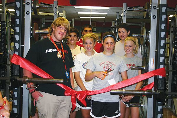 SALT LAKE CITY —The newly renovated Chester Fassio Weight Room was dedicated at Judge Memorial Catholic High School Sept. 9. Student Body President Hannah Brodke cut the ceremonial ribbon to commemorate the official opening of the weight room. The dedication is a continuation of the informal celebrations that have occurred since the school kicked off its 90th anniversary celebration with the rededication of McCarthey Stadium Aug. 13, 2010. Among those at the ribbon cutting were members of the Kladis family, Judge Memorial principal Rick Bartman, Judge Memorial advancement director Mary Purk and several varsity head coaches. The complete remodel of the weight room was made possible through the generosity of Kris Fassio Kladis, a 1970 graduate of St. Mary of the Wasatch High School; her husband, Mike Kladis, along with sons Stephen and Richard, graduates of Judge Memorial in 1998 and 2001, respectively. Chester Fassio, for whom the weight room was named, was Kris Fassio Kladis’ father and a lifelong supporter of Judge Memorial and the Catholic community. He passed away in 2004. "My father’s parents immigrated to the United States from Italy and my father was born shortly after," said Kris Kladis, who grew up in Kearns and attended Saint Francis of Xavier Parish. "He grew up during the Depression on Fassio Egg Farm, our family business, which is still in operation, and learned to work hard. He could not speak a word of English when he started first grade, but grew up to be a good business man. He always taught us the importance of giving back and he always supported the Catholic Church. He was a very generous man. I know that he would want us to do the same." "We are deeply grateful to the Kladis family for making this a reality for our students," said Bartman. "The students are impressed with the quality of the equipment, which is on par with the weight rooms at the University of Utah and other Pac-12 schools." On behalf of the student body, Brodke expressed her gratitude for the donation that funded the weight room. "Over the summer I was in the school for a dance camp and on my way to the dance studio, I was distracted by the bright new paint in the room. I came in to explore with a couple of my friends and didn’t want to leave," she said. Jack Barnett, a senior at Judge Memorial and a member of the football and baseball teams, said the room has helped students increase their strength and also made a difference on the playing field. Since the kickoff of the 90th anniversary Judge Memorial has been celebrating "Judge Pride" during home football games, the annual Bulldog Boogie, a Bulldog Golf Scramble, the annual gala, a tribute to veterans, and a spring "Random Acts of Kindness" service project. They will conclude the anniversary celebration with the annual gala in November. Judge Memorial became a school in 1921. From 1920 to 1926, the Daughters of Charity of Saint Vincent de Paul conducted a Catholic elementary school in the former Judge Mercy Home and Hospital. A co-educational high school was added with the Sisters of the Holy Cross coming from Saint Mary’s Academy to teach the high school students. The first class of 10 students graduated in 1925. The school was known as Cathedral High School and Grammar School until 1929, when the Most Rev. John J. Mitty, then Bishop of Salt Lake City, named the school Judge Memorial School, recognizing the John J. Judge family’s support of the Catholic Diocese of Salt Lake City.