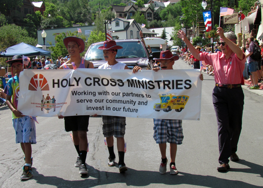 Holy Cross Sister Mary Ann Pajakowski walks with the Holy Cross Ministries After School Program children in the Fourth of July Parade down Main Street in Park City. See more photos on the Intermountain Catholic facebook page.