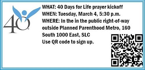 SALT LAKE CITY — Local participation in the national 40 Days for Life prayer vigil will begin on March 4 with a prayer rally outside Planned Parenthood Metro in Salt Lake City.