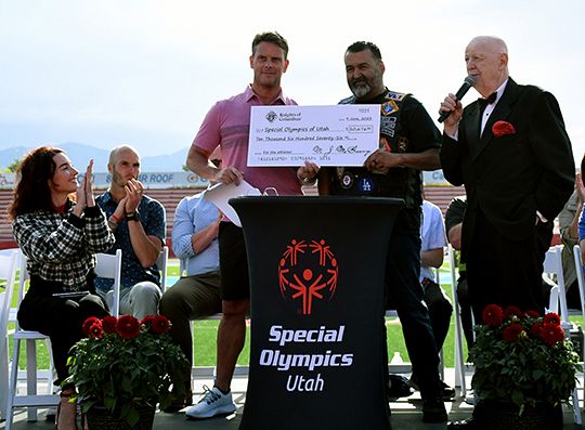 David Matyjasik, State Special Olympics chairman for the Utah Knights of Columbus (right) and Frank Carmona, Utah State secretary, present a check for $10,676.40 to Tony Smith, a Special Olympics Utah Board member, during the opening of the 2023 Summer Games at Granger High School on June 9. Seated at left is Michelle Wolfenbarger, chairwoman of the Special Olympics Utah Board of Directors.