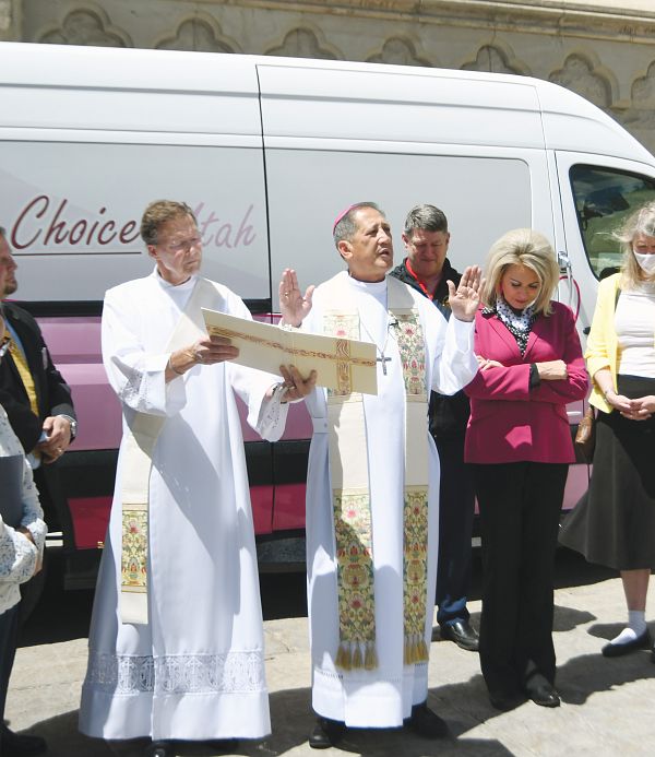 On May 12, the day the ultrasound was donated, Bishop Oscar A. Solis blessed both the machine and the van in the plaza at the Cathedral of the Madeleine. Before doing so, he thanked Pro-Life Utah, the Utah Knights of Columbus and representatives from the Supreme Council, the Diocese of Salt Lake City Respect Life Commission Chair Catherine Stokes and Office of Family Life Director Crystal Painter for their partnership “in order to promote the culture of life” in Utah, he said. “The use of these ultrasounds has saved many lives here in our city. Life begins right there; life is holy, sacred, and we have to protect and nourish it.”