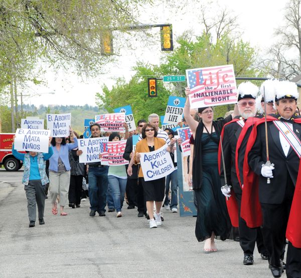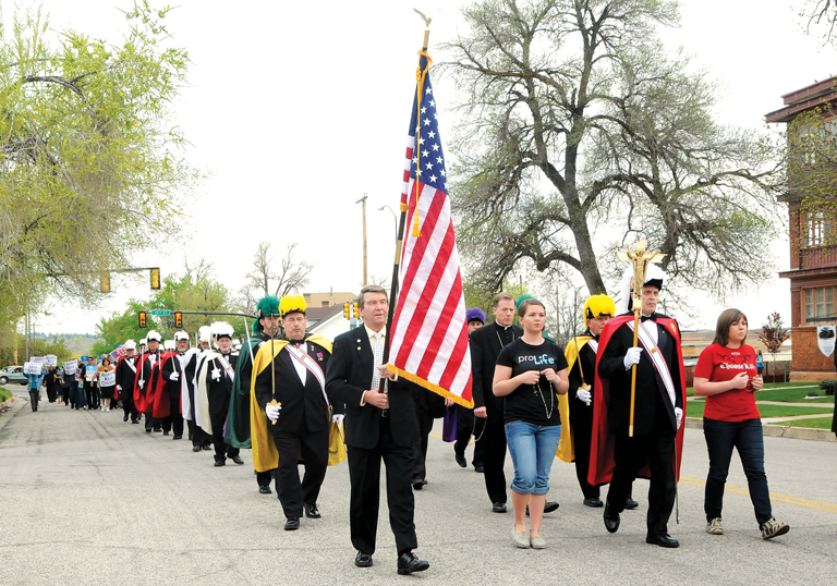 OGDEN — The Knights of Columbus displayed their pro-life values May 7 with a Walk for Life in Ogden prior to the awards dinner that was part of their annual convention. During the four-block walk from the convention hotel to Saint Joseph Church, participants recited the rosary, led by the Most Rev. John C. Wester, Bishop of Salt Lake City. Pat Reed and his daughters Andrea and Stacey were at the front of the procession. Pat Reed wore the Fourth Degree Knights regalia and carried the cross, his daughters wore pro-life T-shirts and carried rosaries. "Our mom was very pro-life," Andrea Reed said. "She passed away a couple months ago. She saved me from dying from abortion." Both Andrea and her sister were adopted, and being asked to participate in the walk was important because their mother saved them, Andrea said, adding that she was thinking of her mother during the walk. She also thought that, without her mother, she wouldn’t know the people she knows, or have the future she plans; a senior at Saint Joseph Catholic High School, she has been accepted to Utah State University’s bio-veterinarian program. More than 100 people participated in the walk, including Knights, their families and Saint Joseph parishioners. Among them were Dave McClellan and his wife, S’Tracy. Dave McClellan is a Fourth Degree Knight. S’Tracy McClellan, a choir member at Saint Joseph Parish, said she was constantly praying for the babies during the walk, and she also thought often of Mother Mary. This is the first time that the Knights’ annual convention began with a Walk for Life. The idea came up during one of the first planning sessions, said Edward Burns, district deputy for District #1. "We all zeroed in on it because we’re all pro-life and it was going to be Mother’s Day, too," he said. During his homily at the Mass that followed the walk, Bishop Wester drew an analogy between the Gospel reading of the disciples on the way to Emmaus and the Knights’ procession in support of the sanctity of life. The procession, he said, was symbolic of the way Jesus calls Catholics to walk together. Any one person probably would have felt silly, walking through Ogden alone, carrying a sign or praying the rosary in support of the sanctity of life, he said. "It would have been very difficult, but together there was a sense of helping each other find the way, supporting each other, encouraging each other," the bishop said. "We were true pilgrims, allowing the Lord to lead us who knows where. When you’re a real pilgrim, you don’t care so much about the destination. You know that being on the way is enough, and that the Lord will provide for everything, and the Lord will make sure that we get to where he wants us to go."