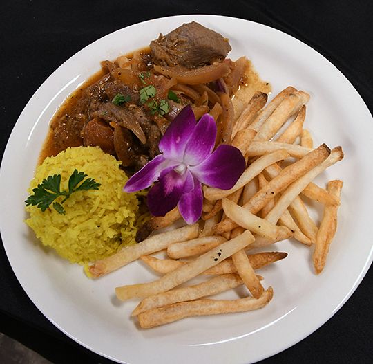 Los platos servidos en el almuerzo del 6 de marzo fueron seleccionados por Elvia Mendoza, miembro del más reciente grupo de estudiantes, Nativa de Perú Mendoza trabajó en la cocina de una guardería y en un restaurante en su país de origen antes de llegar a los Estados Unidos el año pasado. El menú consistió en papa a la huancaína, una selección de pollo o lomo saltado, y de postre una tarta de queso bañada con salsa de caramelo y de fresa a elección.
