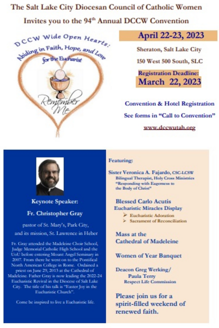 SALT LAKE CITY — El Consejo diocesano de Mujeres Católicas llevará a cabo su convención anual del 22 al 23 de abril en el hotel Sheraton de Salt Lake City. El tema de la convención es “DCCW abre los corazones: llenos de fe, esperanza y amor por la Eucaristía (“DCCW Wide Open Hearts: Abiding in Faith, Hope and Love for the Eucharist” .)