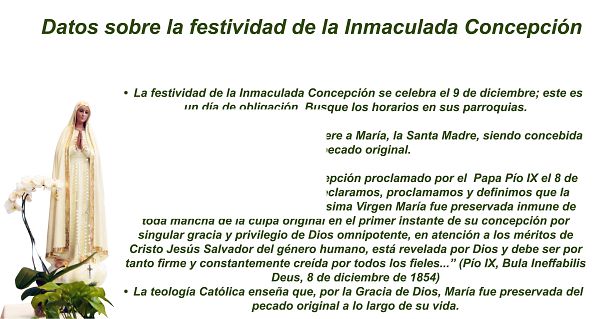 La Conferencia de Obispos Católicos de los Estados Unidos explica a la Inmaculada Concepción de esta manera “En anticipación a que ella iba a dar vida al Hijo de Dios, María fue redimida desde su concepción del Pacado Original. A esto lo llamamos Inmaculada Concepción. Ningún pecado la tocaría para así ser una madre adecuada y una portadora digna del Hijo de Dios.”