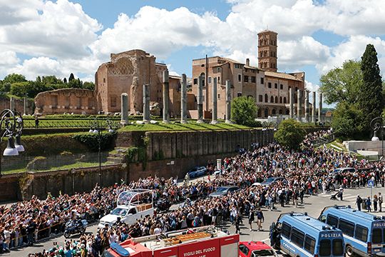 El féretro del Papa Francisco es conducido más allá del Foro Romano en su camino hacia su lugar de en-tierro en la Basílica de Santa María la Mayor en Roma el 26 de abril de 2025.