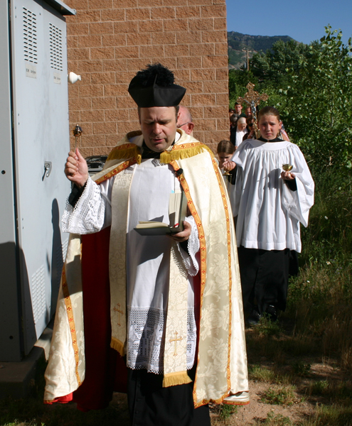 OGDEN — El 20 de junio cerca de 200 feligreses del área de Ogden oraban salmos conforme procedían alrededor de los terrenos en las afueras de la parroquia católica de Saint James the Just, mientras el Padre Erik Richtsteig bendecía la iglesia con agua bendita durante la Liturgia de Reparación para la sanación y purificación. Los participantes oraron la Letanía de los Santos conforme entraban a la iglesia a bendecir el interior. La Liturgia de Reparación fue llevada a cabo para purificar y sanar después de los eventos del 16 de junio en donde durante una de las misas James Evans, de 66 años de edad, fue severamente herido por un disparo. Charles Richard Jennings, nuero de Evans, enfrenta cargos por homicidio y otros cargos más en conexión con los disparos. "Cuando Jim fue herido en la parroquia, dos de las bancas fueron dañadas y tuvimos que llamar a una compañía de limpieza de escenas de crimen, pero ese fue el daño físico", dijo el Padre Richtsteig. "Creemos que también una violación espiritual fue hecha a la parroquia y a través de nuestras oraciones es que estamos ayudando a reparar el daño". Antes de la procesión el Padre Richtsteig dijo que "Es un poco intimidante el volver aquí, pero no tenemos nada que temer ya que la persona que le disparó a Jim está en prisión. Quiero orar por él… él es nuestro hermano. Aún más importante, Jesucristo el Señor se ha dado a nosotros y no vamos a dejar que el diablo nos aleje de nuestra iglesia. Ese día aquí hubieron muchas personas realmente muy valientes; aquellos que se hicieron cargo de las familias, niños valientes que se protegieron, hombres valientes que detuvieron al atacante y previnieron que continuara disparando y personas valientes que se hicieron cargo de Jim". Tara Evans, la esposa de James Evans, dijo que la Liturgia de Reparación "realmente muestra la solidaridad de esta iglesia ya que las personas de aquí son cercanas y se aman los unos a los otros, y creo que es porque nuestro sacerdote cree que todos somos como una familia; el nos mantiene unidos como familia. Después del tiroteo el Padre Erick les decía a las personas lo que deberían de hacer para cuidarnos. Esta Liturgia es también una manera de cuidarnos". Tara Evans dijo que todavía puede recordar la imagen del atacante entrando a la iglesia sacando el arma y disparando a su esposo y después apuntándole el arma a ella. "Mi reacción fue dejarme caer y cubrirme, y fue entonces cuando Paul Conway me salvó de recibir un tiro. Es mi héroe". Conway, quien fungía como acomodador ese día, se abalanzó sobre el atacante para que este no pudiera disparar más tiros y entonces junto a otros seis hombres corrió tras de él para atraparlo. "Me gusta mucho el hecho de que la iglesia esté siendo bendecida y de que todos nos unamos en uno. Volver aquí es difícil, pero el poder caminar por la iglesia mientras es bendecida realmente ayuda". Usualmente la iglesia es serena y tranquila "así es que me alegra que la estamos bendiciendo y purificando del demonio", dijo Emily Ann Watkins, feligrés de St. James. "Me sentía enferma desde que esto sucedió, y lo primero que hice cuando escuche las noticias fue rezar el rosario por Jim". Sherri Hansen, feligrés de St. Joseph, dijo que ella llegó para mostrar su apoyo a los feligreses de St. James y "para mostrar a la comunidad que no tenemos miedo y no dejaremos que el demonio entre en nuestras vidas". El Padre Richtsteig dijo que está sorprendido con la bondad de todos, con las llamadas telefónicas, los correos electrónicos y los mensajes pro Facebook que ha recibido de todo el país ofreciendo oraciones y condolencias; agregando que está agradecido por el apoyo del Padre Ken Vialpando, Párroco de St. Joseph en Ogden. El Padre Vialpando participó en la Liturgia de Reaparición.