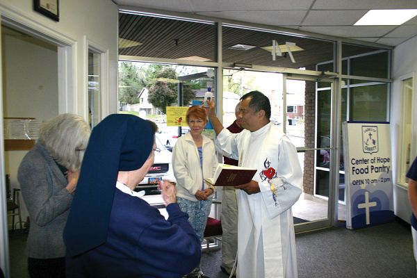 NORTH SALT LAKE — The Ladies of Charity (LOC) of the Diocese of Salt Lake City held an open house to bless the new location of their Center of Hope Food Pantry and to offer tours May 18. Father Reynato Rodillas, Saint Olaf Parish pastor, blessed the new facility located in North Salt Lake City up the street from the previous location. "Organizations like the [Ladies of Charity] are so important for two reasons: It provides a way for people to give, and also there are people in need," said North Salt Lake Mayor Len Arave. "I don’t think the government programs are as effective as when someone can come in here and receive spiritual nourishment, which is what they need often as not, and get the food they need for their physical well being. This is a place people can come for needs in life, for household goods and clothing. We are so pleased to have them here in our community." The Center of Hope began in 2008 as a food pantry for residents of North Salt Lake, West Bountiful and Woods Cross. The pantry is open one day a month for clients to receive supplemental food boxes and now serves about 25 families each month. Now on the second Saturday of the month when the pantry is open, clients also can have bicycles and computers repaired. Valerie Myers, a Lady of Charity, and her family are offering these services. Myers’ father, George Espinoza, has agreed to fix bicycles. "We’re also trying to get bicycle helmets and chains to secure the bicycles," said Myers. "People who are poor can’t always eat the best nutritional food and we can’t always offer that in our pantry because we can’t offer fruits and vegetables, so we’re offering the children exercise on their bicycles." Myers’ husband, Vince Myers, has agreed to fix computers or donate computers so children will be able to do their homework. The Myers’ two sons, Gabriel and Seth Myers, have volunteered to clean the bicycles and also to sell slushies and donate the proceeds to the LOC. "The LOC has truly enhanced our family life and the boys outlook on serving the poor," said Valerie Myers. "The boy’s have really opened their eyes to the issues of the poor and ways they can help." The LOC facility offers a larger workspace and more shelving," said Sandy Stark, LOC St. Olaf Chapter president. "We offer our clients household goods, bedding, appliances, and clothing. We are here for the essentials people usually need in an emergency." The LOC Saint Olaf Chapter first began boxing food in the driveway of the Daughters of Charity convent in Bountiful when Sister Charlotte Marie Clark started the organization in 2003. Two years later they moved to the Center of Hope located on Center Street in North Salt Lake. In 2008, the Our Lady of Lourdes Parish chapter began in Salt Lake City. Both groups box food out of the Center of Hope. The Salt Lake group delivers about 40 boxes to people’s homes and the Bountiful group delivers to about 60 families living on the west side of Salt Lake. All deliveries are done on a monthly basis. The Ladies of Charity will host its annual BBQ June 30, at St. Olaf Parish to raise funds for its Christmas program, which serves more than 100 children.