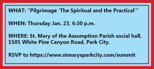 “Pilgrimage: The Spiritual and the Practical” by Luke Stager will be Thursday, Jan. 23, 6:30 p.m. in the social hall of St. Mary of the Assumption Parish, 1505 White Pine Canyon Road, Park City. RSVP to https://www.stmarysparkcity.com/summit