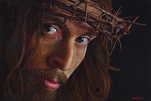 The painting, “The Lamb of God,” shows Jesus, crowned with thorns, looking directly at the viewer. It is the work of Mark Goodson, a Huntsville resident. Goodson, a member of The Church of Jesus Christ of Latter-day Saints, agreed to lend the parish a print of the original work at the request of Father David Trujillo, pastor.