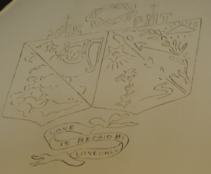 MIDVALE —The mystery is solved. The shield on the wall in St. Therese of the Child Jesus’ little rock church is, appropriately enough, modeled after the coat of arms that the Carmelite nun drew at the end of her first manuscript in 1896. Saint Ambrose parishioner Kaye Calfo read the Intermountain Catholic article about the shield in the little rock church and that St. Therese pastor Father Martin Diaz didn’t know what it represented. Calfo chose Therese as her Confirmation name when she was 12 and "I have continued all my life to get to know her," she said. "She is a wonderful but sometimes misunderstood saint. I have many books about her, and that is how I discovered the meaning of the shield." The St. Therese’s coat of arms includes symbolism such the Morning Star of Mary shining on a small flower, the palm of martyrdom, and a triangle representing the Trinity. Below the shield in the Midvale church is an English translation of St. Therese’s motto ‘L’amour ne se paie due pas l’amour,’ or ‘Love is repaid by love only.’ The left side of the coat of arms depicts the Child Jesus dreaming about his future Passion. The shield in the little rock church is believed to have been painted in 1927. It does have one small mistake: rather than ‘FMT’— for Marie-Francoise Therese — the painting shows a P rather than an F. Father Martin Diaz, pastor of St. Therese of the Child Jesus parish, said he’s considering correcting the painting so it will have the correct initials.