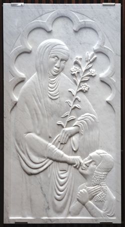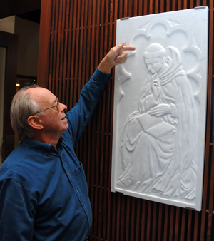 SALT LAKE CITY — For Ed Braak, one was more than enough. Hands cold and sore from working in the carport for more than a year on the same chunk of rock, Braak promised himself there would be no more of this. But the mind of an artist is a tricky thing. "After the unveiling of St. Catherine, I mentioned to him the other wall would be a great place for a St. Dominic," said Dominican Father Peter Rogers, pastor of St. Catherine of Siena Parish and Newman Center near the University of Utah. A year later, the artist was again suffering from sore, cold hands. On Aug. 8, the feast of St. Dominic, Braak’s latest relief was unveiled at St. Catherine Church. Across the principal door from the original St. Catherine relief, both sculptures in Carrara marble share a similar, complimentary design. In the fourteenth century, Andrea Vanni of Siena, Italy, frescoed the interior of the church of St. Dominic. A contemporary of St. Catherine of Siena, his painting of the saint provided the inspiration for Braak’s sculpture. Softening the face and other elements, Braak subtly brought the fresco into three dimensions. "When Catherine was finished, I didn’t know if Dominican Father Denis Riley (previous pastor of St. Catherine of Siena Parish) would like St. Catherine. I couldn’t get him to come to the house to see it until it was nearly finished. When he saw it, he said ‘Oh! I like it,’ and then he wanted to leave right away. He said later ‘I was so scared that it would look awful and would have to take it anyway," said Braak in an interview with the Intermountain Catholic. After Fr. Peter had made his remark about a St. Dominic relief, Braak began ruminating about the possibility of taking on the task again. "I just love to do this sort of stuff," he said. "I did some research and found a Fra Angelico fresco. Dominic is a very small part of the original. I decided I should put a framework similar to what was around St. Catherine, and that would make them more of a pair. I began working on that, and it took another year of work." Braak’s inspiration for the St. Dominic relief came from Blessed Fra Angelico Giovanni da Fiesole’s fresco of "The Mockery of Christ" in the convent of St. Mark in Florence, cell seven. In this work, St. Dominic is a diminutive figure in the lower right. Entirely self taught, Braak keeps detailed records of all his work in a well-worn notebook, yellowing at the edges. "I try things and then I record them in my notebook. When I first wanted to start doing sculpture, I wanted to take lessons, but there was nobody who would teach me in Utah. So I read a couple books and got a chunk of granite from the mountain and started banging away on it." Braak began both sculptures in clay models after researching the subjects extensively and sketching cartoons of his designs. Satisfied with the models, he photocopied them and measured the inset depth from the top, making a detailed topography with thousands of measurements. Approaching the marble, however, is another matter. According to Braak, "It cuts easily, it’s not that hard, it polishes nicely, it’s fairly easily available." St. Catherine’s size, 19 inches by 36 inches, was determined by the largest piece of stone he could cut from the slab available. For St. Dominic, he had his supplier cut it for him. Once he began cutting, the work was slow. "I have a diamond blade that cuts aggressively, and use it to take out any of the deep areas. It looks awful. Then I have a high speed drill tool and use carbide bits. Then many smaller sizes, for smaller details. Finer details like eyes, hair, and flowers are done with dental burrs. They can only be used once; my dentist is nice and he saves them for me. Finally comes the polishing, the hardest part. I Start out with a 60 grit sandpaper, and I also have a very small belt sander but it only works if I’m very gentle with it. I sand until my fingers are too sore to do anything more. And then I say, ‘that’s it.’ I’m done." Together with his wife Barbara, a painter, the Braaks create art in acrylic paints, watercolors, and pastels, as well as granite, quartz, alabaster, honeycomb calcite, marble, and wood. According to Ed, "We don’t compete. I don’t paint and she doesn’t sculpt. We get along. We criticize each other." Barbara quickly added, "and we’re pretty tough." For those who look closely at the relief of St. Dominic, the subtlety of the work will offer a few details. The veins on St. Dominic’s left hand are modeled after the artist’s. A halo can be seen at just the right angle, the carefully polished stone reflecting the light. Above St. Dominic’s head, a star reminds the viewer of one of the stories of about the 12th century saint. According to Braak, "a nun wrote that when he was teaching them, they observed a bright shining star in the middle of his forehead." Dominican Brother Michael Augustine Amabisco of St. Catherine of Siena Parish thinks highly of Braak’s bas reliefs. "But we have a whole list of dominican saints! St. Thomas Aquinas, St Martin de Porres – he bi-locates so we’ll need three or four of him." Braak chuckled.