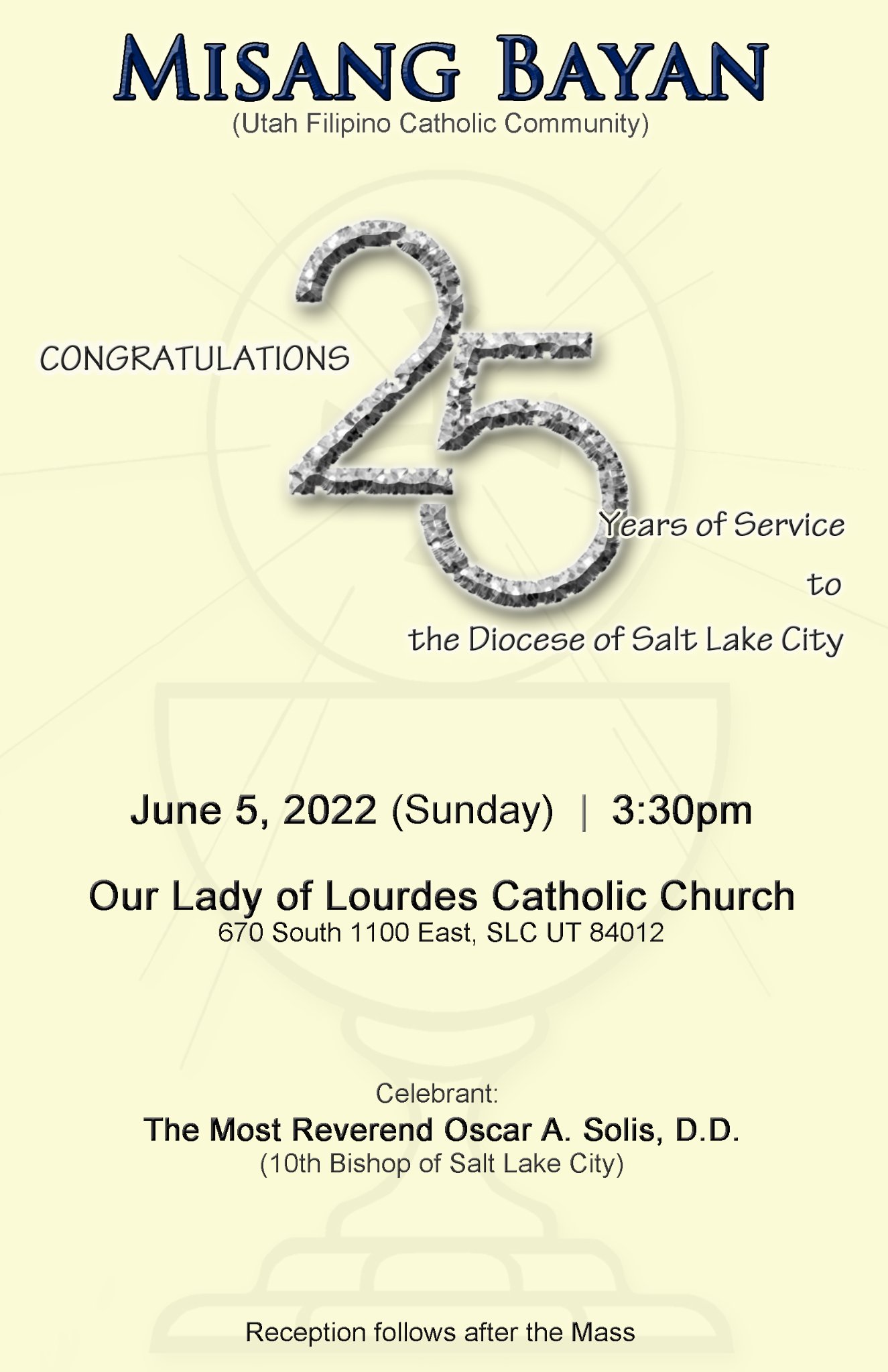 The first Filipino Mass in Utah was celebrated on April 6, 1997 at Our Lady of Lourdes Catholic Church.