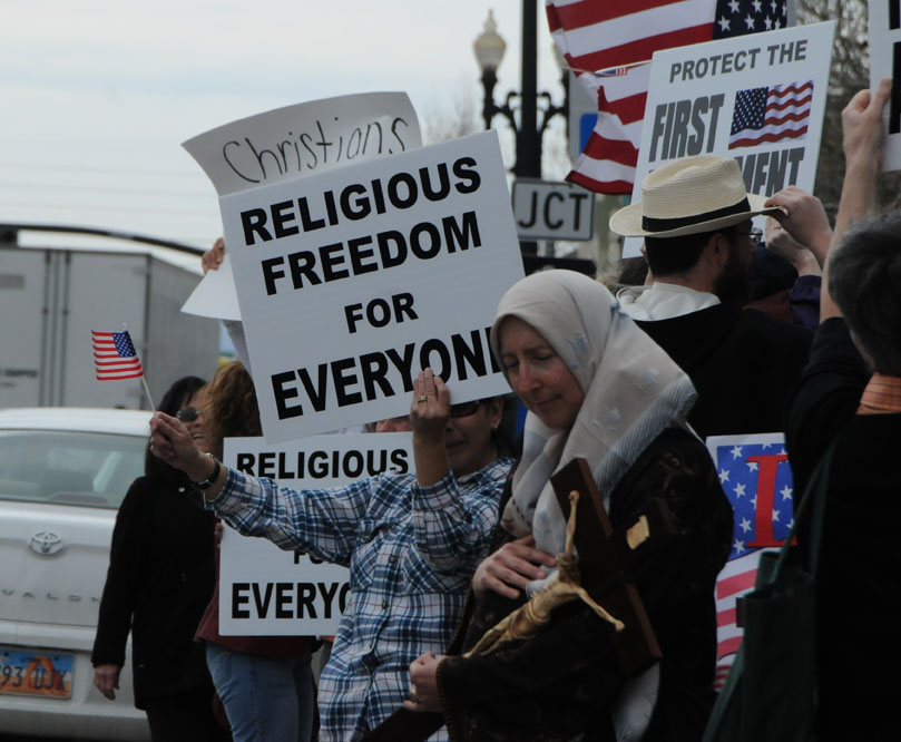 SALT LAKE CITY — About 150 people, including numerous Catholics, participated in the Stand Up for Religious Freedom rally at noon in front of the Matheson Courthouse in Salt Lake City on March 23, protesting the federal mandate that requires most religious employers to provide contraceptive coverage. They joined groups in about 140 cities nationwide; nationally, the event was organized by the Pro-Life Action League of Chicago, Ill. and the Citizens for a Pro-Life Society in Detroit, Mich. Several speakers were on the agenda at the Salt Lake City rally, including three religious leaders, four candidates for various political offices and a representative of an elected official. Among those who attended the rally was Ken Harris, who joined a group of fellow Blessed Sacrament parishioners. "We have to stand up for our freedoms; this is a First Amendment issue," said Harris, who brought a copy of the Constitution and quoted from memory the First Amendment’s religious clauses. "It can’t be more clear than that," he said. Father Joseph Frez from Saint Francis of Assisi Parish in Kearns has signed online petitions against the mandate and given a homily about the fact that the issue is religious freedom rather than politics. He attended the rally because, he said, "I decided as a Catholic and as an associate pastor I need to be with the people. This is about religious freedom. It is going against our conscience." Likewise, Colleen Carter from Saint Ann Parish in Salt Lake City brought 10 signs that read "Religious Freedom for Everyone" and handed them out to others at the rally "because people don’t realize what all is involved. The secular society believes it’s just ‘you’re stopping my contraceptive,’ [but] it’s all about democracy and what our country stands for." Among the most noticeable rally participants was Lisa Bachiller of Saint Thomas More Parish in Sandy, who carried a large crucifix and was clad in an authentic Iraqi dress to depict Mary, the Virgin Mother, because if Mary had not said ‘yes’ to God, then Christ would not have died on the Cross, she said. "I want to help Jesus get the message across," said Bachiller, who lived in Iraq and Sudan for several years and heard Christians in those countries tell of persecutions they suffered. "I want to help people realize they need to step out of their comfort zone," she said. "Apathy is worse than pain." Among the speakers was the Rev. Darin Lovelace of Saint John’s Anglican Church Park City, who said that under the HHS mandate, "Free exercise of religion will be prohibited for any people of faith because our religious liberty is more than just our freedom to assemble in a particular place on a particular day and worship in the way that we please." Church-run hospitals and schools are an essential part of the church’s mission, he said. "Our contribution to society from these institutions is immeasurable, and these benefits are not just for Roman Catholics, but for people of all faiths, or even of no faith, who are receiving their services…. The federal government seems to want to dictate that our moral convictions cease to have meaning beyond the threshold of the church, or the synagogue, or the mosque. That is not what our founders sought to protect." The rally’s closing speaker was Father Erik Richtsteig, pastor of Saint James the Just Catholic Church in Ogden. Opposition to the HHS mandate "is about religious freedom, and religion is not something we keep in the closet," Fr. Richtsteig said. "It’s not something we close our doors for. It’s not just something we do on Sundays. Our Lord Jesus Christ was vociferous in condemning those people who would say one thing on a Sunday and do something [else] the rest of the week. We have the obligation to live our faith 24/7, in private and in the public square, and that’s what this is all about."