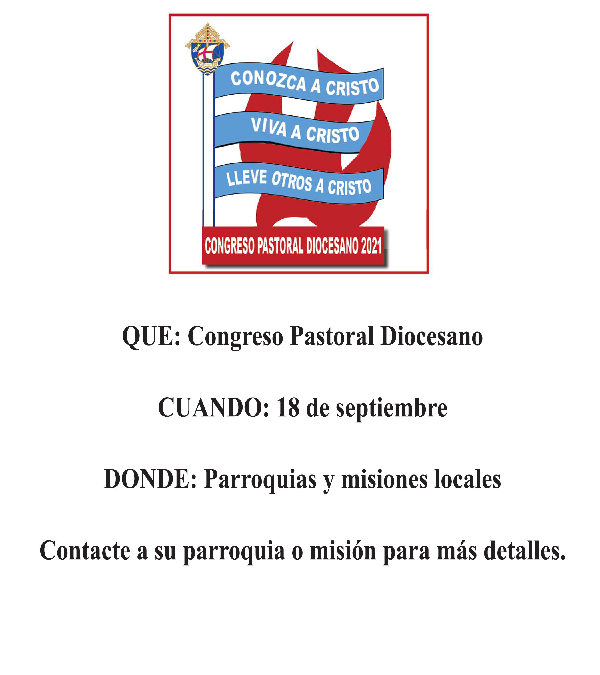 SALT LAKE CITY – Durante el próximo Congreso Pastoral Diocesano, pá-rrocos, catequistas, líderes laicos y Católicos locales, se reunirán en sus parroquias y misiones para escuchar los mensajes pregrabados los cuales subrayarán el tema del Congreso ‘Conozca A Cristo, Viva A Cristo, Lleve otros A Cristo’, elegido por el Obispo Oscar A. Solis.