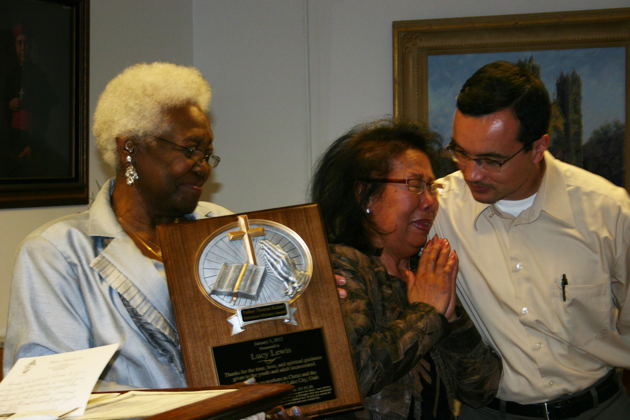 WEST VALLEY CITY — Lucy Lewis was surprised and grateful when her name was called as the Volunteer of the Year at the Father Thomas J. Kaiser Award Banquet for the Catholic Ministry of the Incarcerated Youth and Adults held at the Diocese of Salt Lake City Pastoral Center Jan. 20. Illa Wright, coordinator of the incarcerated ministry, presented Lewis with the award and thanked her for her 30 years of service. "I just want to do Christ’s work without recognition," said Lewis, a member of Saints Peter and Paul Parish. Lewis loves working for the Church and serving the poor, said Wright. "I met her in 1982 at her convenience store on 3rd West and 6th South in Salt Lake City," she said. "I used to visit her there. Lucy would cook for and feed the homeless living under the viaduct and I used to help her. That’s when she started visiting the incarcerated at the Wasatch detention center. When the Oxbow Jail opened, they placed women there and they all knew Lucy. She had helped them in some way. Lucy had also owned and operated the Jean Pierre Beauty Salon and if women could not afford to pay her, she would do their hair for free." Lewis had a real love for the poor and no matter what age they were they called her ‘Mom’ because "I would listen to them, give them advice, and I was the only one who understood them," Lewis said. "I would talk and eat with them and sometimes if they didn’t have any food, I would pack some for them. I didn’t like them drinking on an empty stomach, so I would make them eat first. When they got arrested, they would call my store collect from the jail. If they took a train out of town, they would tell me where they were going." In 1993, Lewis took over 200 poor people to Wanship Dam on buses donated by Lewis Brothers. "I told them if they drank, they would have to find their own way home," she said. "This day was time for them to sort out their lives. I stayed up all night cooking for them and they had so much fun. Marlboro donated red T-shirts for them and they made posters for the buses that read ‘Here go the Homeless.’" Lewis is a spiritual person, knows her faith and is a wonderful teacher, Wright said. "She teaches the incarcerated the Catechism of the Church and about the Bible." When Lewis visits the incarcerated, she discusses the weekly Mass readings. "I tell them what they’ve done is all behind them and Jesus will forgive them; Jesus is here to save our souls," she said. "That helps them realize they have choices." Lewis immigrated to the United States from Korea in 1973, working for the U.S. government in telephone exchange. Saints Peter and Paul Parish was dedicated in 1972, and when Lewis arrived a year later, she got involved to help further establish it. She is a minister of Holy Communion at Mass and distributes Communion to the sick and homebound. "I am a staunch Catholic," she said, adding that she learned her religious traits from her mother. "My mother taught me strict morals and good principals and I have passed them on to my son," she said. "Lucy is also a breast cancer survivor," said Wright. "God has blessed her and Lucy said she owes all of this to Our Blessed Mother. Lucy is just a dear friend of mine."
