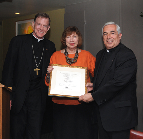 The 2011 Madeleine Award, given by the Madeleine Arts and Humanities Council, was presented to Ruth Lubbers, executive director of VSA Arts of Utah and the Art Access Gallery. Criteria for the annual award include contributions to the arts in Utah long-term dedication and integrity. Presenting the award were (left) the Most Rev. John C. Wester, Bishop of Salt Lake City; and Monsignor Joseph M. Mayo, pastor of the Cathedral of the Madeleine. Msgr. Mayo also gifted Lubbers with an illustrated Book of Psalms. IC photo/Marie Mischel