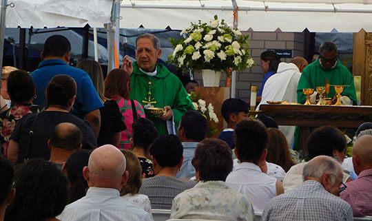 For the July 16 occasion, people gathered in the parish parking lot, which was decorated for the celebration. Bishop Oscar A. Solis presided at the Mass; Fr. Sasa concelebrated. Deacon Dale Dillon assisted.