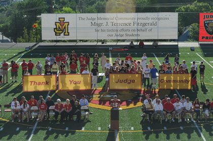 SALT LAKE CITY — Judge Memorial Catholic High School kicked off its 90th anniversary celebration with the rededication of its sports stadium. The field collapsed in 2008 and left the Bulldogs dependent on the good will of other local schools for a playing field for practices and home games; the reopening was in time for the 2010 football season. The Red & Gold Day on Aug. 13 included not only the McCarthey Stadium rededication but also lacrosse, volleyball and soccer scrimmages as well as a football game and barbecue. "I have two words to sum up the evening for all of you," said Principal Rick Bartman during his comments at the rededication. "Welcome home!" Of the many dignitaries at the ceremony, Bartman singled out Msgr. J. Terrence Fitzgerald, vicar general of the diocese; Holy Cross sisters Catherine Kamphaus and Genevra Rolf, superintendent and associate superintendent, respectively, of Utah Catholic Schools; Michael Lee, director of pastoral operations; Shannon Lee, director of the Diocesan Development Drive; Joan Loffredo, diocesan chief financial officer; Joe Sasich, past president of the board and currently a coach, and his wife, Ann. This group has "been the dream team, the movers and shakers, the squad who worked day in and day out to ensure that we actually reached this point of reopening the field," Bartman said, adding that, "Because of the McCartheys, this stadium was started, and because of them we are standing here this evening in a stadium that has been reborn." He also particularly thanked Msgr. Fitzgerald, Class of 1954, whom he called "a true patron of Judge. To say he works tirelessly on behalf of our students is an understatement. All of us at Judge Memorial Catholic High School are very, very grateful for his guardianship, his guidance, his encouragement and his prayers." While the field may look complete, some work still must be done inside the stadium, Bartman said. "That work, however, will have minimal impact on the Bulldog student athletes, who have been waiting to get back on their field, and no one has been more eager than these students." Jeff Scott, student body president, concurred. "We have been waiting for this day for a long time, and now that it is here, it is great," Scott said. "All of the students at Judge know that this rededication is because so many have worked so hard. Know that we are proud to be Bulldogs. Know that we are proud of our stadium, and we make this promise to you tonight: Know that we will make you proud of us."