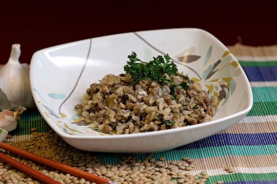 In a large pot, cover lentils and rice in water and soak for 10-15 minutes. Next, bring water to a boil, reduce heat to medium and cook until water is absorbed, about 20 minutes. In a separate pan, sauté garlic and onions in oil until translucent, then add to rice-and-lentil mixture. Season to taste. While stirring, slowly pour whisked eggs into the rice-and-lentil mixture; the egg should spread out in “ribbons.