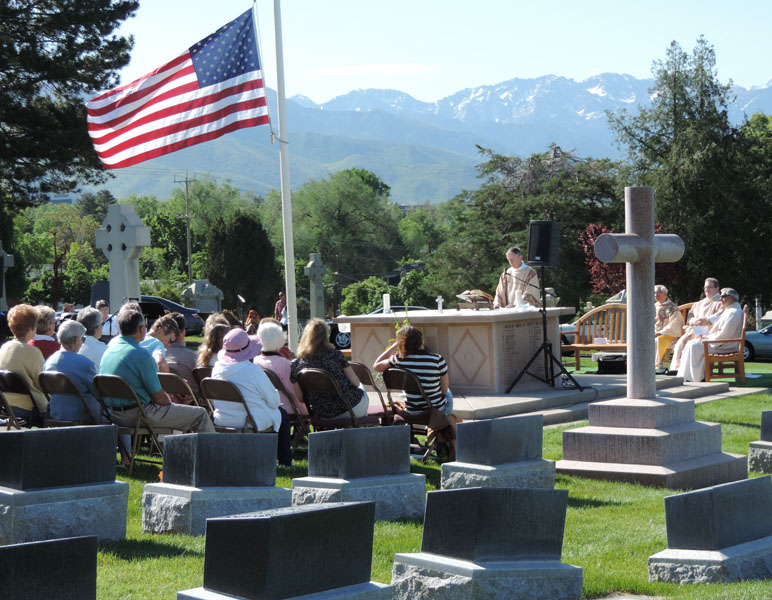 The Diocese of Salt Lake City’s annual Memorial Day Mass was celebrated May 27 at Mount Calvary Catholic Cemetery. Father Dominic Thuy Dang Ha, pastor of Our Lady of Perpetual Help Parish, was the main celebrant; concelebrating were Monsignor Joseph Mayo, rector of the Cathedral of the Madeleine; Father John Norman, pastor of Saint Vincent de Paul Parish; and Father Eleazar Silva, the Cathedral’s parochial vicar. Deacon Lynn Johnson was the homilist. Deacon Dale Dillon assisted at the Mass. SEE ADDITIONAL PHOTOS ON THE INTERMOUNTAIN CATHOLIC FACEBOOK PAGE. IC photo/Marie Mischel