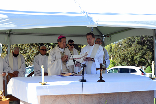 Bishop Oscar A. Solis celebrated the traditional Memorial Day Mass at Mount Calvary Catholic Cemetery May 31. Concelebrating were Msgr. Colin F. Bircumshaw, vicar general; Msgr. J. Terrence Fitzgerald, vicar general emeritus; and several priests of the diocese. It was an opportunity to gratefully remember, honor and pray for the repose of the souls of those military men and women who “served, fought and died for our country. … giving up their lives so that we may live freely and enjoy stability, prosperity and peace,” said the bishop, who also called to mind the veterans’ families who were left behind. In addition, he thanked the veterans who were present for their service, and thanked God that they “give us a daily reminder of your courage and the sacrifices you have done for our sake.” At the end of the Mass, the bishop asked all of the veterans present to stand to be acknowledged, and he prayed that God would give them health and peace and happiness.