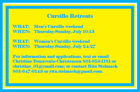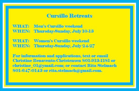The men’s Cursillo weekend will be July 10-13; the women’s Cursillo weekend is July 24-27.