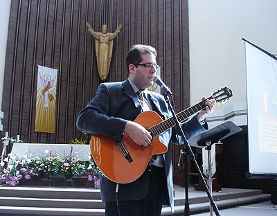 SALT LAKE CITY—"El coro existe para que la gente cante, para ver en qué manera se puede incluir a la gente y fomentar su participación activa," dijo Santiago Fernández, músico pastoralista. Fernández visitó la ciudad de Salt Lake desde Detroit, Michigan para presentar un taller de capacitación litúrgica para los coros Hispanos, patrocinado por las Oficinas Diocesanas de Liturgia y de Ministerio Hispano. El taller se llevó a cabo el pasado 12 de abril en la parroquia de Santa Ana y comenzó con todos cantando el tema "Sal y Luz." Fernández es originario de México, pero lleva 22 años viviendo en Estados Unidos sirviendo a la Iglesia con su música, la cual ha sido merecedora de 3 galardones otorgados por la Asociación de Música y Videos Católicos Unidos (UCMVA, por sus siglas en Inglés) en las categorías de mejor artista, disco y canción internacional. "Una de mis actividades favoritas es componer música para los Salmos porque son textos que deben ser cantados. Tenemos que seguir con esta tradición," dijo Fernández. También habló acerca de la diversidad de la Iglesia en Estados Unidos y de la función de la música en la unidad de las personas. "Necesitamos de personas de todas las nacionalidades para ser fiel a la misión de la Iglesia en este país. Y para, a través del canto, amplificar las voces de tantas culturas." Mario y Lidia Razo, han trabajado en el ministerio de la música ocho y tres años, respectivamente. Los Razo, junto con su hija Mayra y su esposo, son parte del coro de Santa Teresa del Niño Jesús y dicen que esto los une en su hogar. "Siempre aprendemos algo bueno que nos guía como familia," dijeron. El fervor del pueblo no encuentra impedimentos a la hora de servir, según Fernández. "Encuentras gente que no sabe leer música, pero que canta con el corazón, con todo su ser," dijo. "Quiero que la gente salga de este taller motivada, fortalecida y renovada para seguir adelante en su ministerio; y que salga sintiéndose orgullosa de su trabajo y reconociendo la importancia de su ministerio." Fernández podría estar de regreso en la ciudad de Salt Lake en octubre, para otro evento diocesano.