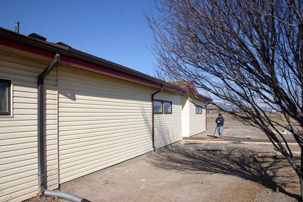 The finishing touches are being put on a new addition to Mission Santa Ana in Tremonton. The $300,000 building project will add four new religious education classrooms to the mission’s current three classrooms, as well as additional storage space and men’s and women’s rest rooms, said Eddy Barela, a member of the mission who is helping to oversee the project. Clockwise from above left, the exterior of the addition is finished with siding matching the original building; Contractor Vance Browne lays cement; one of the classrooms is ready for flooring; a second classroom will include shelves and a sink; a plaque from the Catholic Church Extension Society is testament to the generosity of the mission organization that helped build the original mission building. The diocese has requested a second gift from the Extension Society to help pay for the new addition. Barela said he plans to drill two new wells on mission property to provide water for irrigation and landscaping.