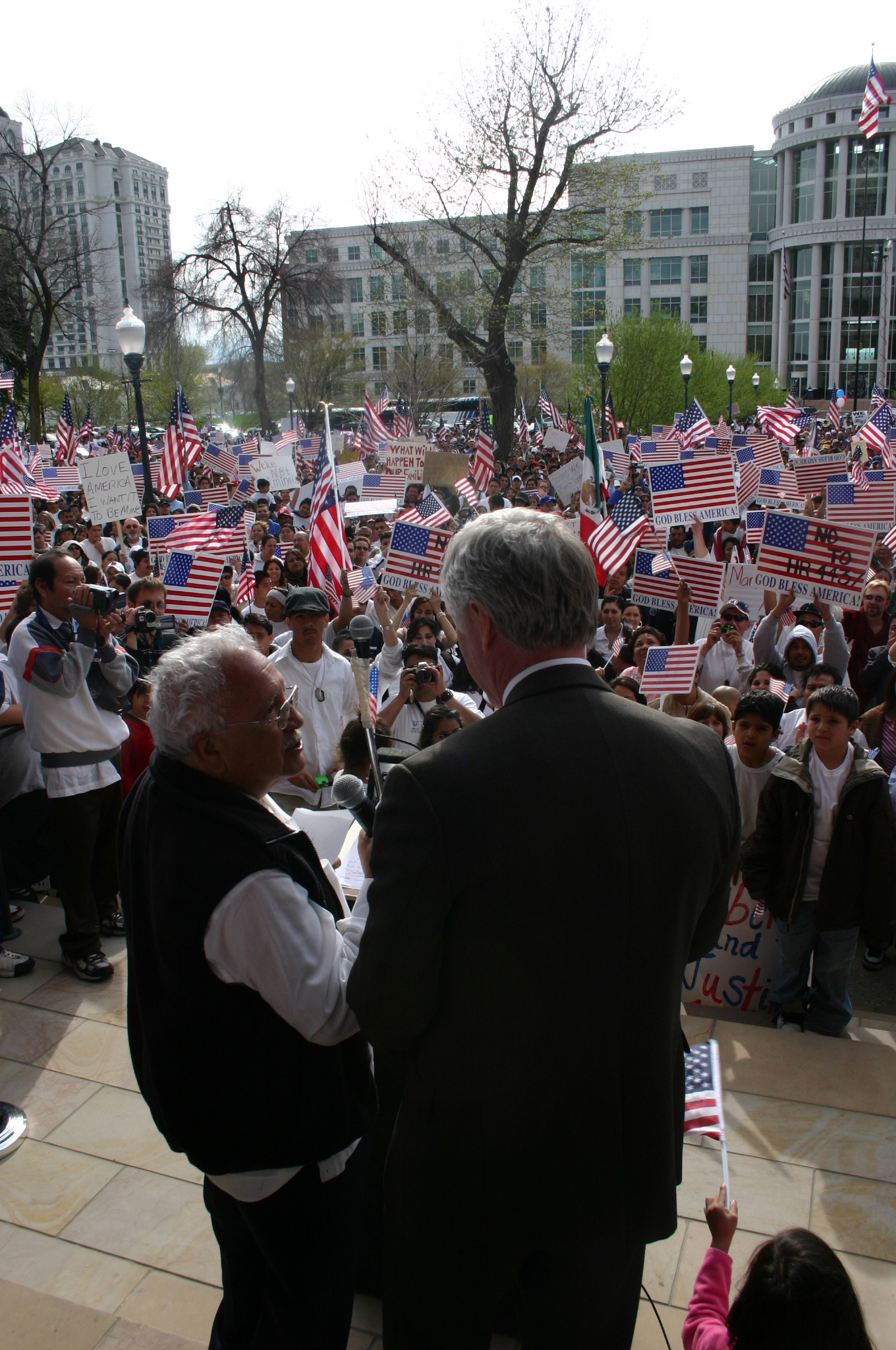 SALT LAKE CITY — Para los activistas Católicos, los puntos predominantes de los mítines y marchas de los dos días, no se refieren tanto a los derechos de inmigración o a los derechos de los hispanos, sino más bien se refieren a los derechos humanos – los derechos que todos los individuos merecen porque todos estamos hechos a imagen y semejanza de Dios. Cuando el Padre Michael Sciumbato, párroco de la Parroquia de San Francisco de Asís en Provo, se subió al podio en el Edificio de la Ciudad y Condado de Salt Lake el 10 de abril para representar a las voces eclesiásticas, él habló elocuentemente acerca de las experiencias de su propia familia como inmigrantes Italianos en los Estados Unidos. «Nos llamaban WOPs», le dijo a la multitud de 5,000 personas. «WOP quiere decir "without papers"» (sin papeles). El mitin de la tarde del lunes fue diferente a la histórica Marcha por Inmigración del día anterior. En el Día Nacional de Acción para los Derechos de los Inmigrantes, los presentadores discutieron soluciones a los problemas que enfrentan no solo los inmigrantes sino todos aquellos que trabajan largas horas con salarios muy bajos, quienes no pueden pagar guarderías para sus hijos, y quienes se enfrentan con decisions tales como comprar medicinas que se necesitan o alimentos para sus familias. Los presentadores urgieron a la muchedumbre que se informen acerca de los problemas claves de la pobreza en América, que se registren para votar y que hagan que sus voces se escuchen. Los asistentes al mitin bailaron, cantaron, agitaron carteles, y gritaron entusiasmadamente cuando Rebecca Chavez-Hauck les urgió a que «se unan a aquellos a través de todo el país en el Día Nacional de Acción para los Derechos de los Inmigrantes. Estos problemas no pueden ser ignorados en nombre de la conveniencia política. No pierdan la esperanza. Podemos vivir mejor… Debemos continuar luchando por la seguridad, la prosperidad económica, y por la compasión para toda la gente de este gran país.» En un inspirado discurso, el Alcalde de Salt Lake City "Rocky" Anderson urgió a los participantes a quitarse las ataduras de la «hipócrita legislación» actual que favorece a la gente que se beneficia de los trabajos con sueldos bajos, y que no ofrece beneficios a aquellos que trabajan por esos sueldos. El les pidió a los participantes que sean buenos vecinos, que se ayuden los unos a los otros, y que «creen un sentimiento de agradecimiento... urgiendo reforma con compasión y cuidado». El Padre Sciumbato, dirigiéndose a la multitud tanto en inglés como en español, les habló a «toda la gente del Libro», y a «la gente de todas las fés» para que «vivan los mandamientos de Dios de amor; cuiden de las viudas, los huérfanos y los extraños entre nosotros.» Él les dijo que amen a todos con un corazón abierto, en el nombre de Cristo. Asegurándoles a aquellos presentes en el mitin que llegará el día cuando todos los Americanos estén juntos «en la paz y la justicia de Dios». «Estos problemas no son problemas de Latinos; no son problemas de inmigrantes. Son problemas de justicia», dijo el Padre Sciumbato. «El día vendrá cuando la justicia lloverá del cielo. Ruego para que ese día llegue pronto.» El Juez Raymond Uno de la Corte del Tercer Distrito de Utah, jubilado, quien recibió en 2005 el premio Espíritu de Excelencia e Inspiración que otorga la Comisión de Diversidad Racial y Étnica en la Profesión de la Asociación Americana de Abogados, compartió la conmovedora historia de como su padre, un veterano condecorado de la Primera Guerra Mundial, murió cuando tenía 47 años de edad en un campo de internamiento para Japoneses. La madre del Juez Uno, una mujer con una licenciatura que vivió y trabajó por 72 años en los EE.UU., «murió como una extranjera porque nunca se le permitió obtener la ciudadanía». El Juez Uno les dijo a las gentes presentes en el mitin que él y otros Asiático-Americanos apoyaban 100 por ciento la cruzada por sus derechos. «Nadie debe sufrir la suerte de mi madre.» Dee Rowland enlace entre la Diócesis de Salt Lake City y el gobierno y directora de la Comisión Diocesana de Paz y Justicia, agradeció a los participantes «por todos los sacrificios que hicieron para poder asistir al mitin y por su valor en unirse para luchar por sus derechos.» Su declaración: «Las Escrituras, así como también la enseñanza social Católica forman la base de la posición de la Iglesia (en reforma migratoria). Juan 4:19-21 nos dice, "cualquiera que dice ‘amo a Dios’ y odia a su hermano es un mentiroso"», originó grandes aplausos y gritos. Rowland pidió por una reforma legislativa que incluya la discusión de las causas que crean la inmigración, la obtención de la legalización y programas temporales de trabajo con protecciones, y restauración del debido proceso para inmigrantes. «Caminamos con inmigrantes vibrantemente presentes en nuestro país y fantasmagóricamente ausentes del suyo», dijo Rowland. «Necesitamos un desarrollo económico sostenible, un intercambio justo, y políticas económicas que tomen en cuenta las dificultades de los trabajadores con poca preparación. Cualquier apoyo debe incluir la conciencia clara de que este no es un problema nacional. El mundo entero está crujiendo con la migración de su gente. Nuestra política nacional debe incluir esta verdad más profunda – somos un mundo, una gente interconectada.» Pidiendo el silencio de la muchedumbre, Rowland cerró su discurso con una oración.
