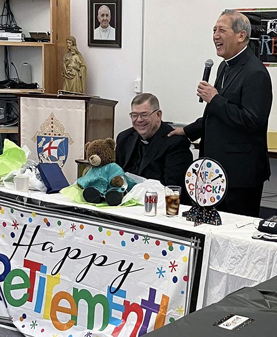 Msgr. Colin F. Bircumshaw was celebrated during a July 31 retirement party. He is shown with Bishop Oscar A. Solis. IC photo/Marie Mischel