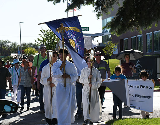 From St. Helen’s, the pilgrimage went to Vernal, where they walked two miles in the afternoon heat from Utah State University-Vernal to Saint James the Greater Catholic Church. About 50 people of all ages joined the Tuesday afternoon procession, which began with the song “Amazing Grace.”