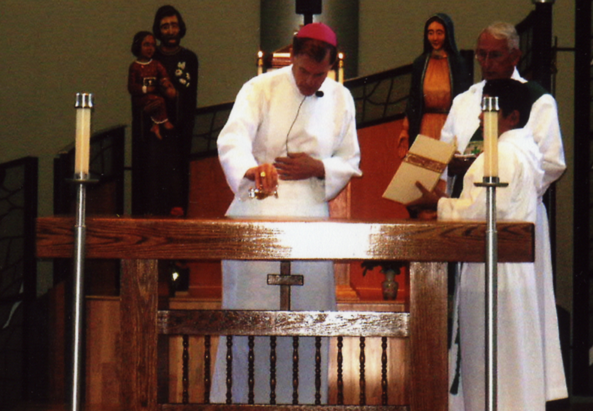 Bishop John C. Wester anoints the new altar of St. Martin de Porres Church in Taylorsville with the oil of Chrism Aug. 5. In addition to the new altar, a new ambo was also set in place. Father Jan Bednarz, pastor of St. Martin de Porres Parish, thanks and congratulates parishioner Steve Moran, designer and maker of the church's new altar and ambo.